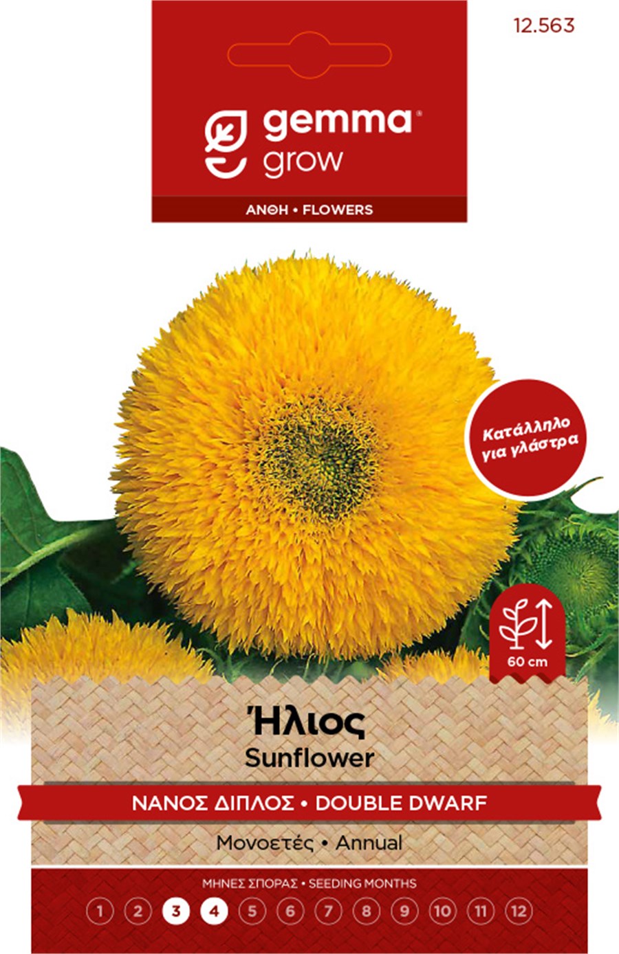 Κατάλληλο για γλάστρα. Μονοετές. Κατάλληλο για ηλιόλουστα σημεία. Mε άνθη διπλά κίτρινα. Απόσταση φυτών (εκ.): 35. Απόσταση γραμμών (εκ.): 50. Βάθος σποράς (εκ.):1-1,5. Ημέρες φυτρώματος: 10. Έναρξη ανθοφορίας (ημέρες): 90. Helianthus annuum. G134