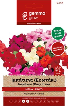 Ιδανικό για σκιερά μέρη. Έτοιμο σε 45 ημέρες. Μονοετές. Κατάλληλο για σκιερά μέρη, με πλούσια ανθοφορία. Απόσταση φυτών (εκ.): 30. Απόσταση γραμμών (εκ.): 30. Βάθος σποράς (εκ.):0,2. Ημέρες φυτρώματος: 10. Έναρξη ανθοφορίας (ημέρες): 45. Impatiens walleriana. I014